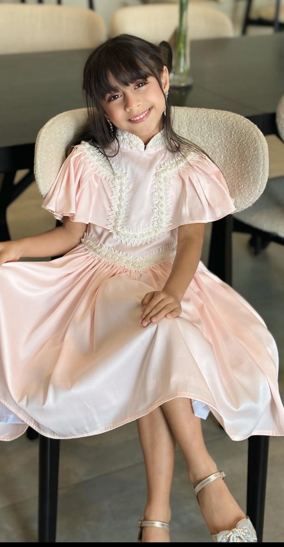 فستان بلون بيبي بنك مع دانتيل ابيض