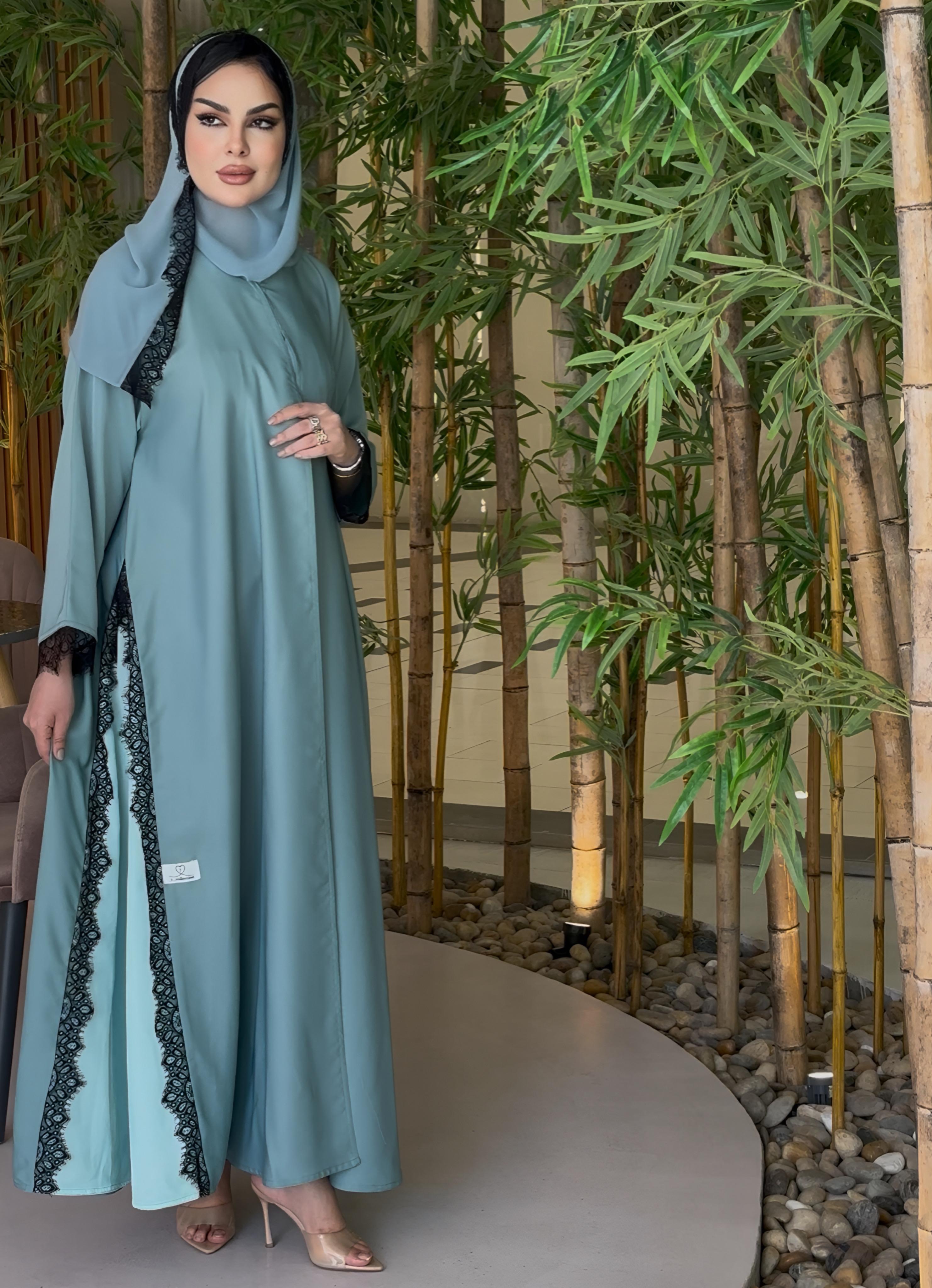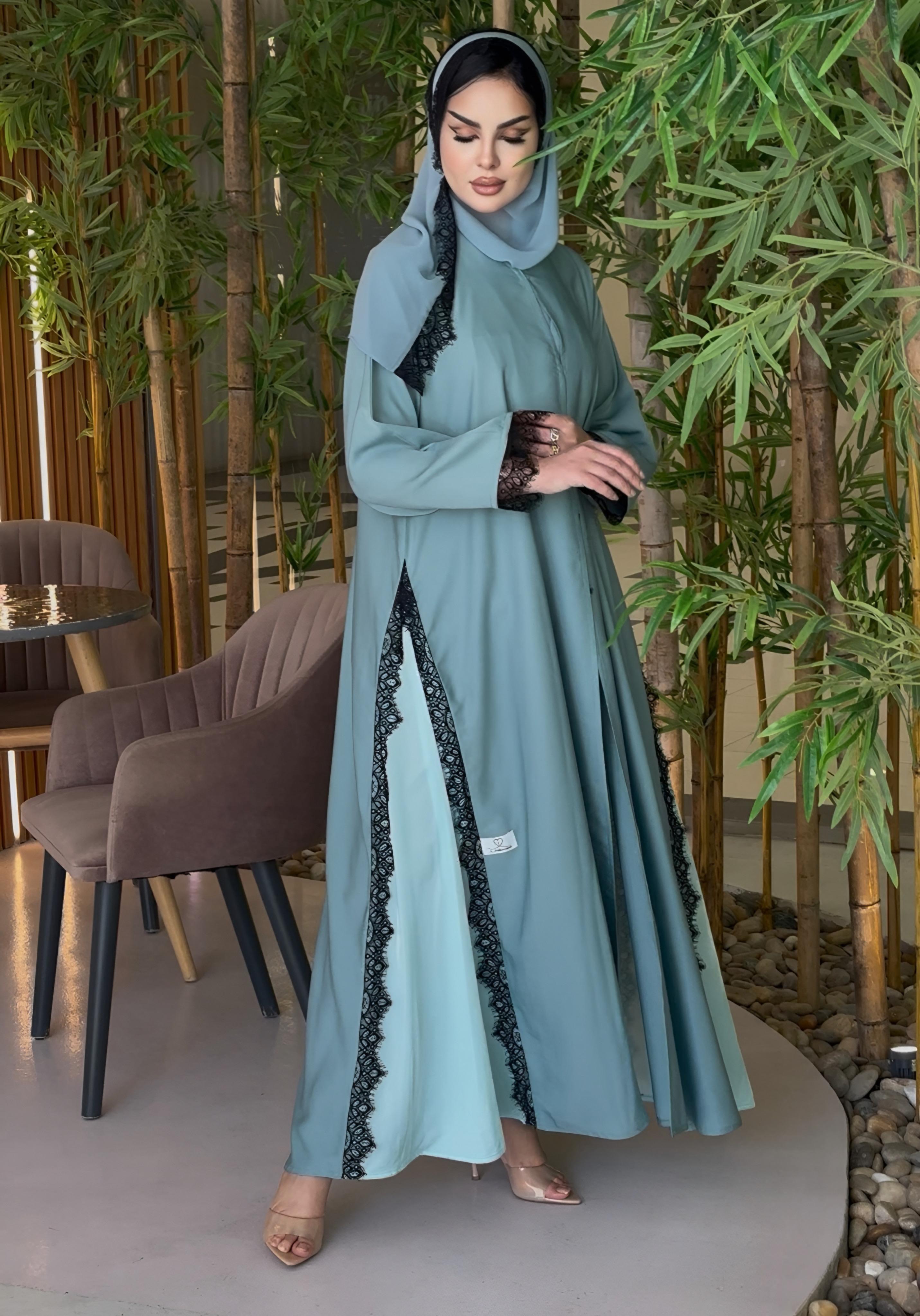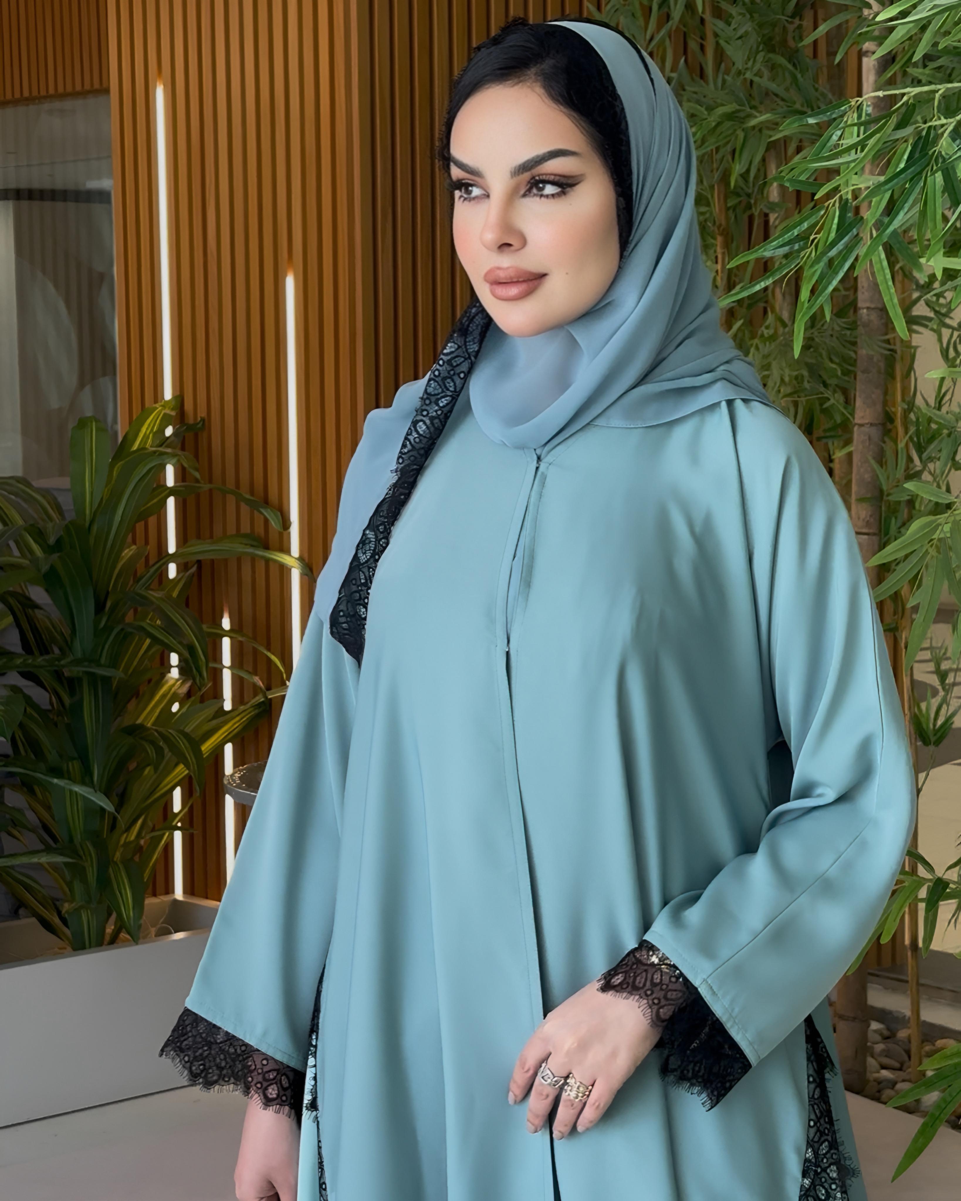 عباية أنيقة و راااقية بلمسة الدانتيل على جوانب العباية و في الأكمام و الشيلة مع مخمل خفيف على جوانب العباية + قصة دبل كلوشش تحلي الجسم 😍